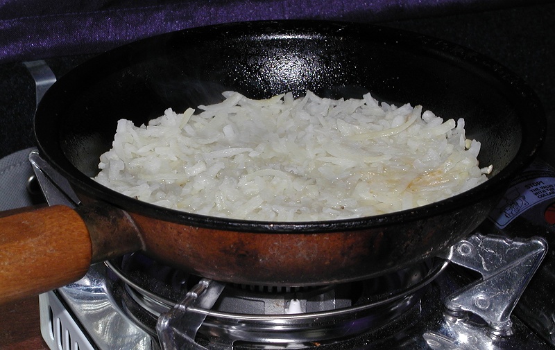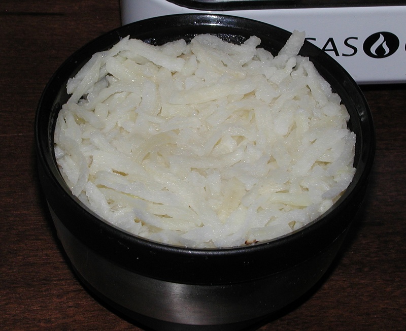 Ready to fry, in the pan (the steam is from the still hot water used to rehydrate the potatoes):