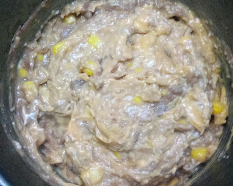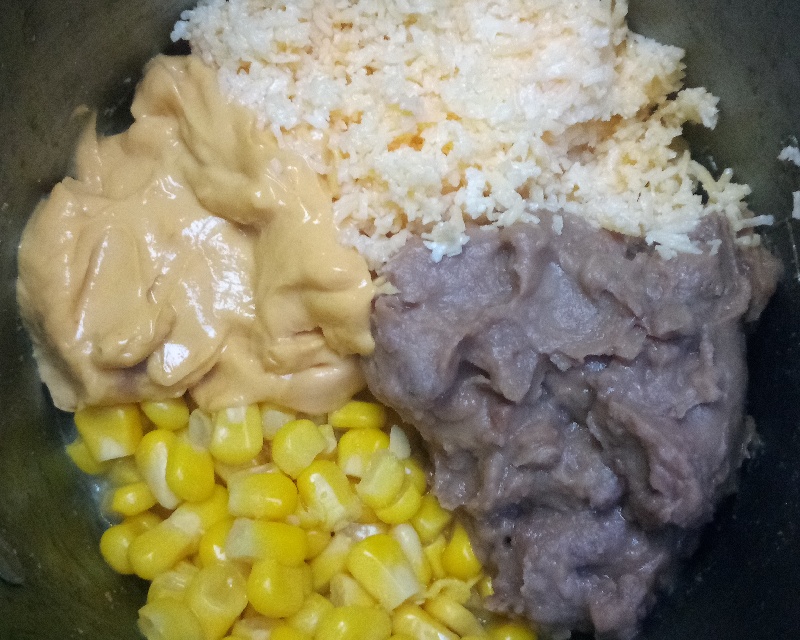 Beans, corn, and both cheeses in insert pot: