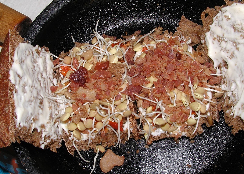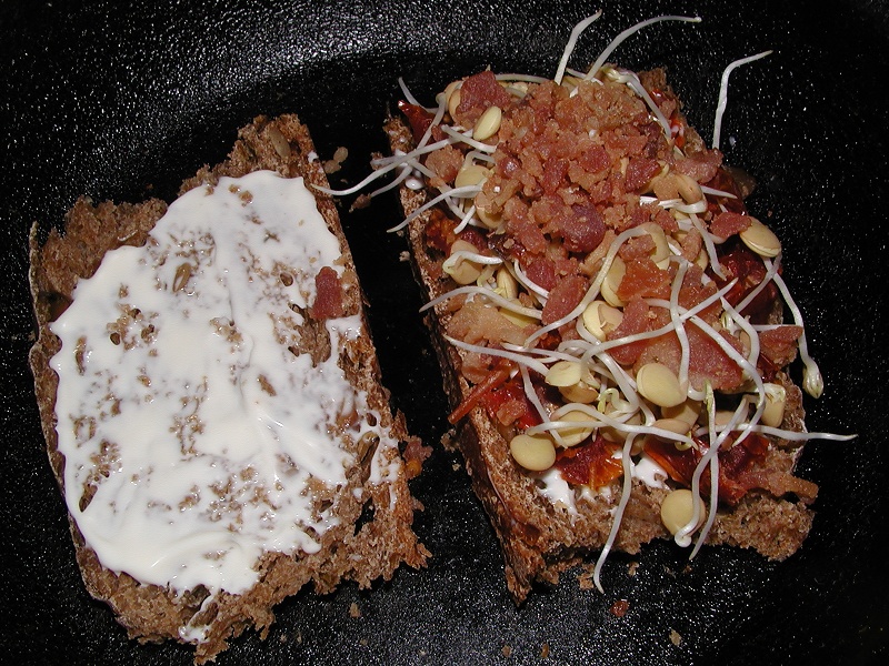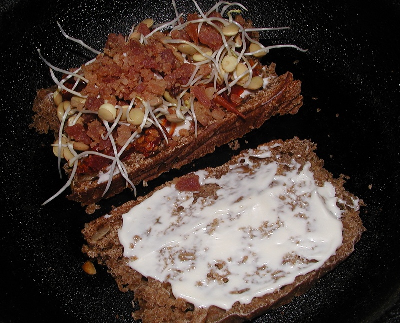 This is a variation of my BST sandwich (Bacon-Sprouts-sun-dried-Tomato), using crockpot Bread instead of factory bread.